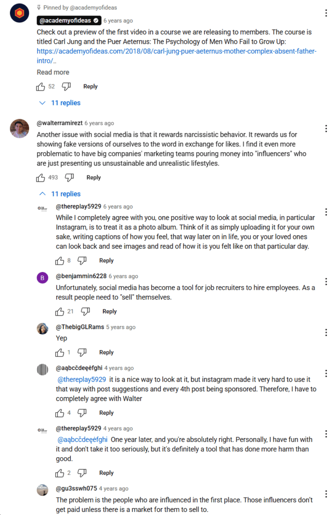 Watching Academy of Ideas felt like taking a class lecture. The video’s dark, minimalistic thumbnails stand out because they’re not flashy. The creator talks about loneliness not just as an emotional state but as an undeveloped sense of self that social media hides. He explains that loneliness often comes from feeling empty inside, not really knowing what you want or who you are. And social media becomes a place to build a fake version of yourself–that public persona I mentioned earlier–to avoid facing that emptiness. That idea felt heavy to me, but it’s honest. It made me think about how scrolling and posting can feel comforting for a moment, but deep down, it never really fixes anything in the long run. It makes me think of how sometimes, likes and comments feel like claps from a crowd that disappears once the video ends. YouTube allows for this kind of professional educational content, but at the same time, it restricts the in-depth engagement by making it too easy to skip away to something else, to something more entertaining when it gets too heavy or boring.
