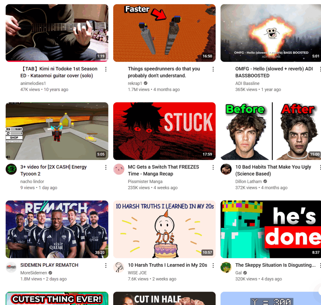 When I first open YouTube, it feels familiar. It’s cluttered yet organized in a way, but also comforting. The home page shows a mix of videos I expect: gaming videos, guitar videos, motivational insightful videos, music videos, anime/manga edits, typical controversial videos, and sometimes random viral clips I don’t care about. It’s like YouTube knows parts of me well but also pushes me things many others watch.